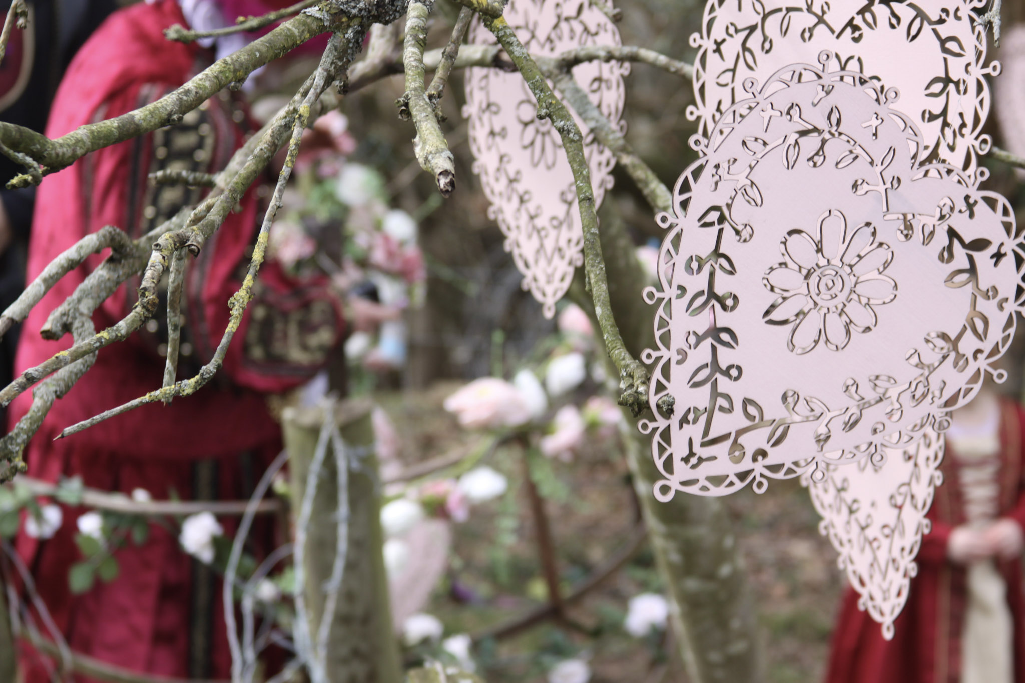 Two Brides dressed in medieval clothes stand beside Pagan Celebrant Keli Tomlin as she performs a Handfasting for them